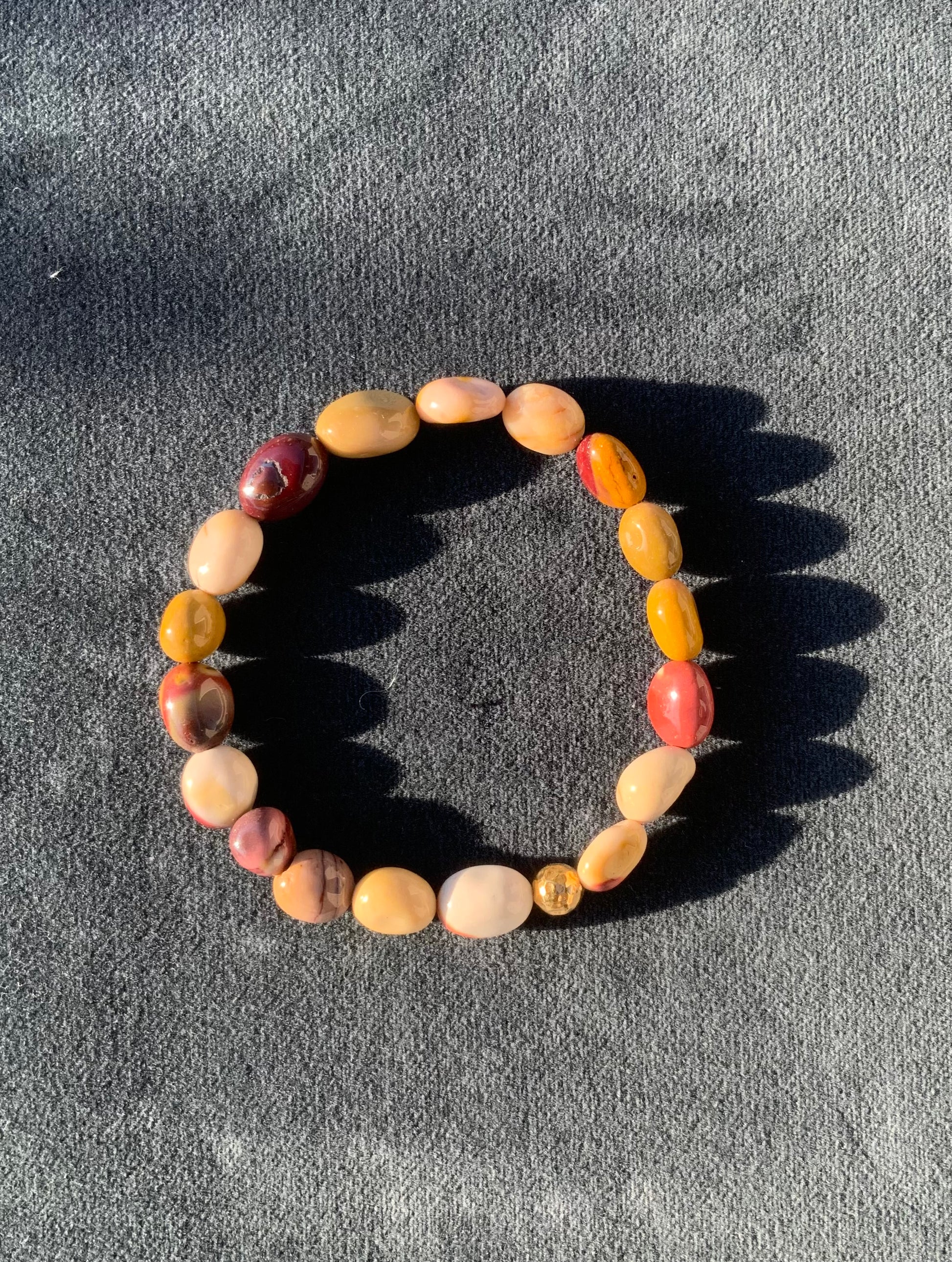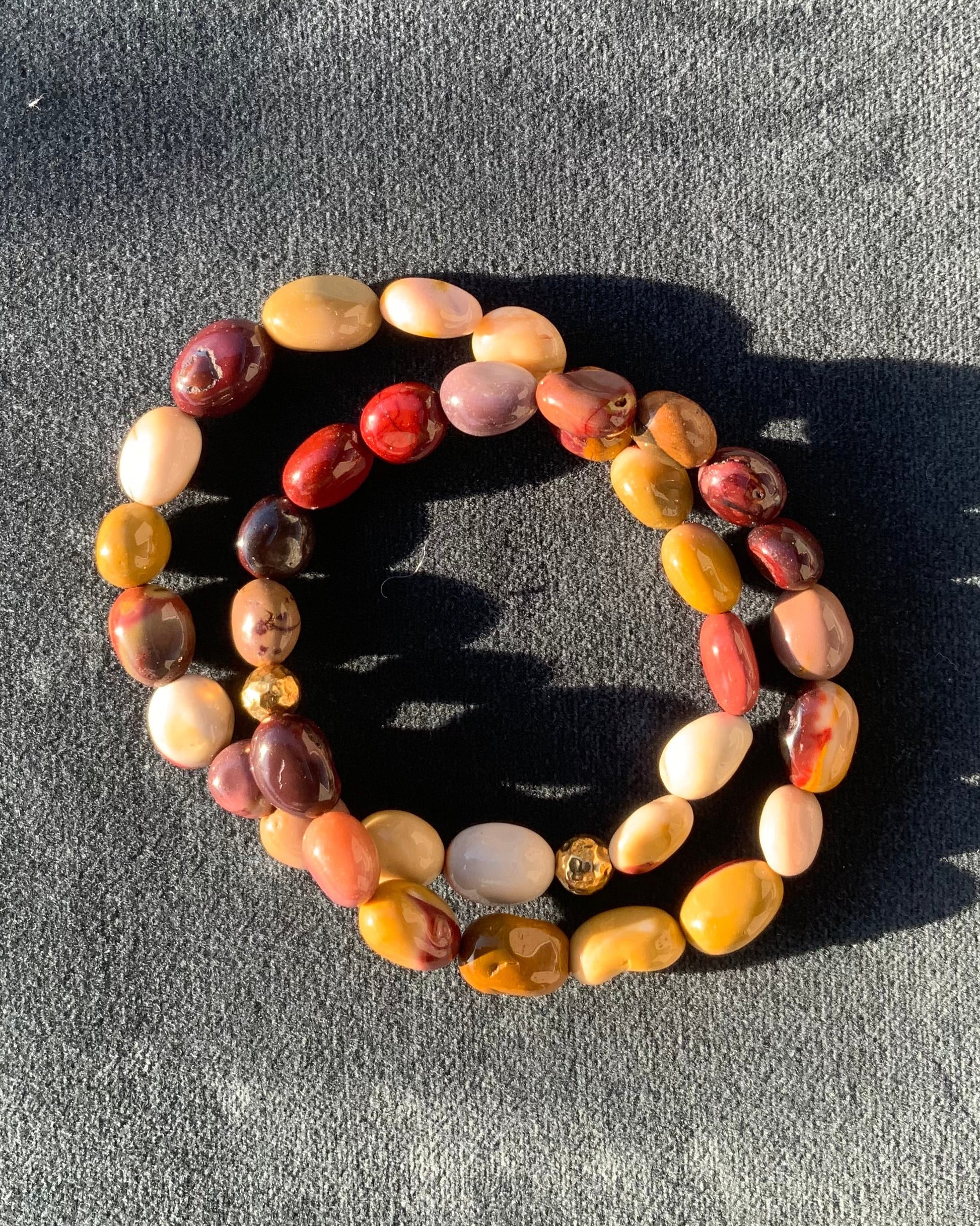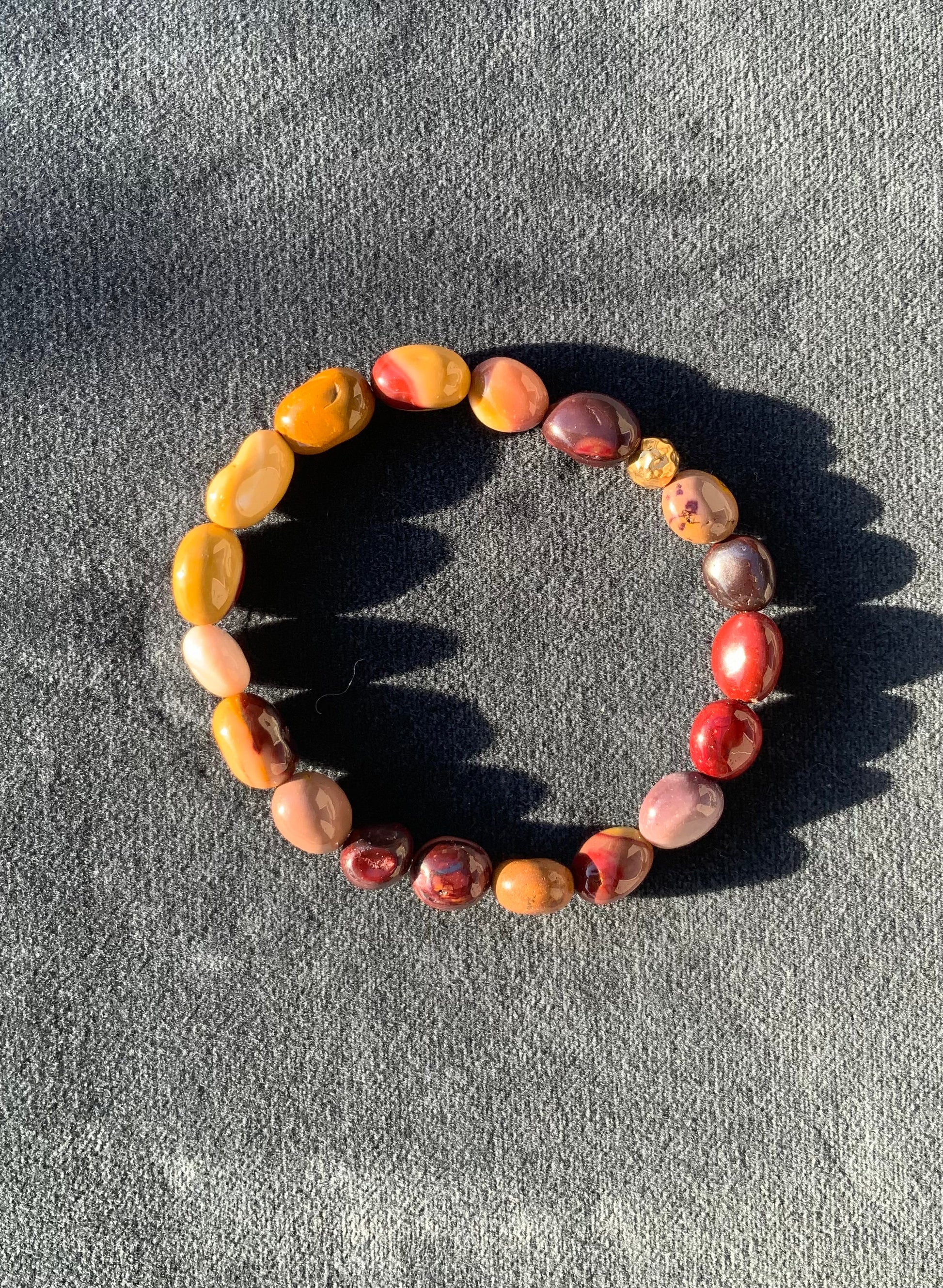 Armbåndet er fremstillet i de smukke mokait nuggets, som varierer i farve over dybt vinrøde, rosa, gule, brune og creme nuancer.