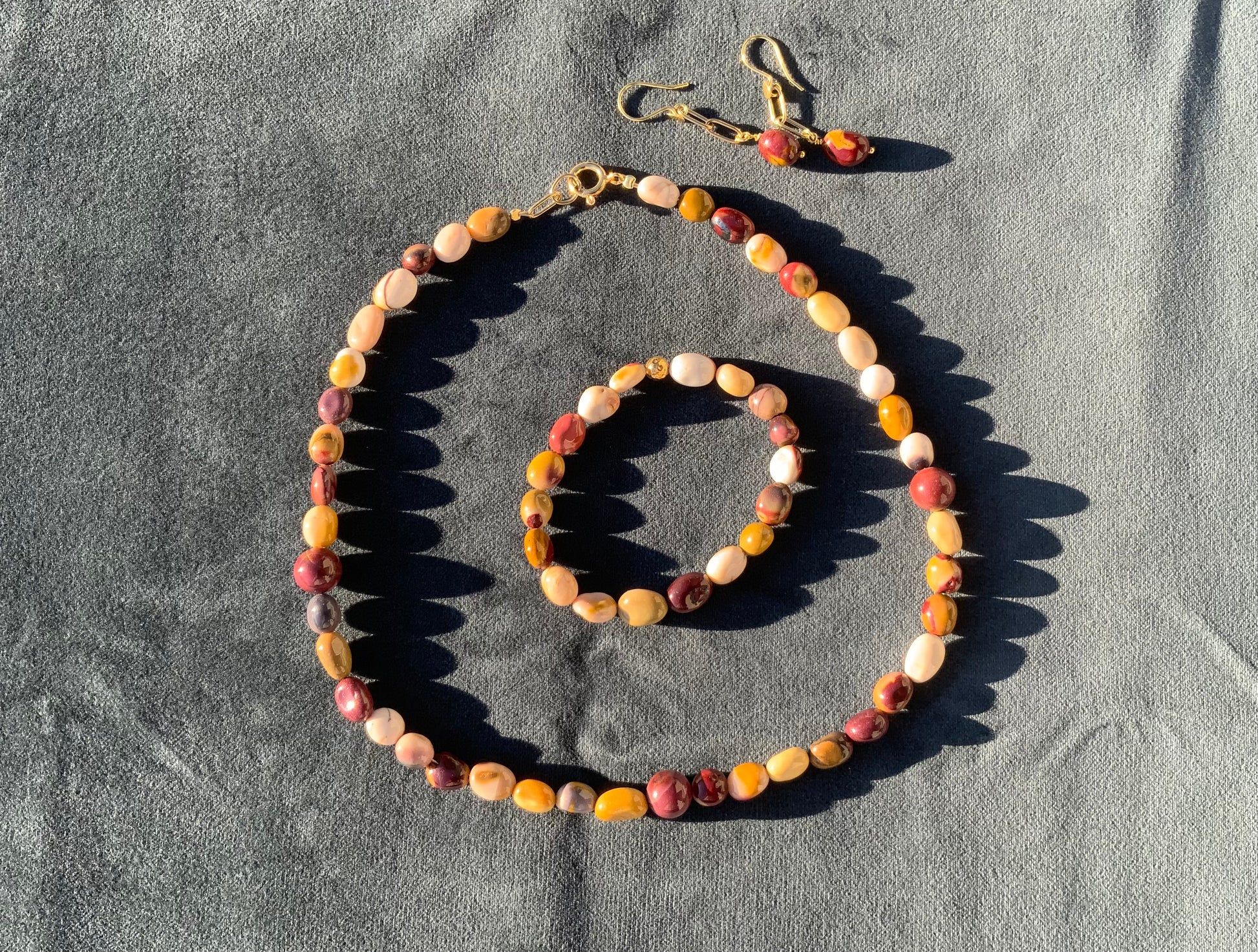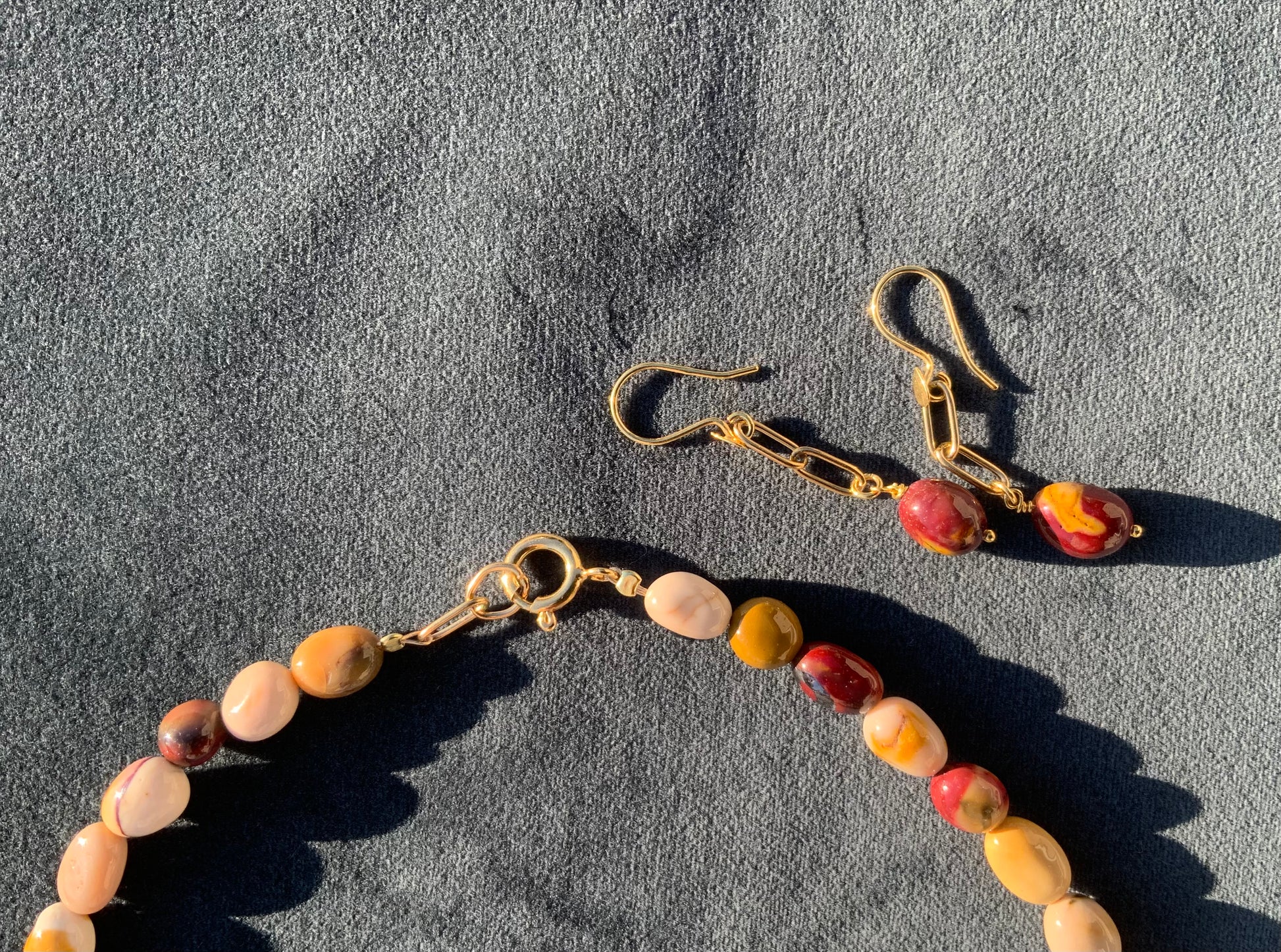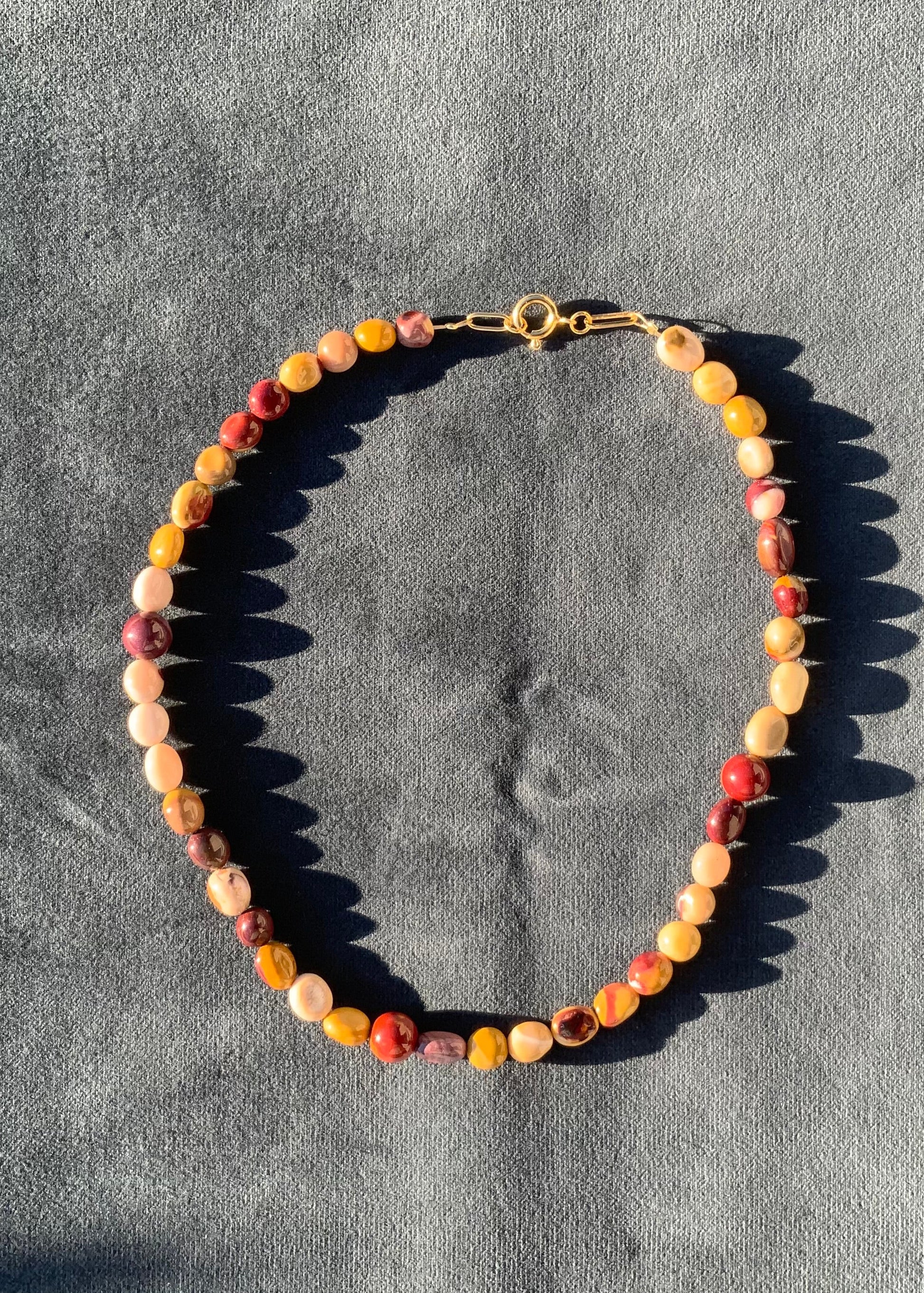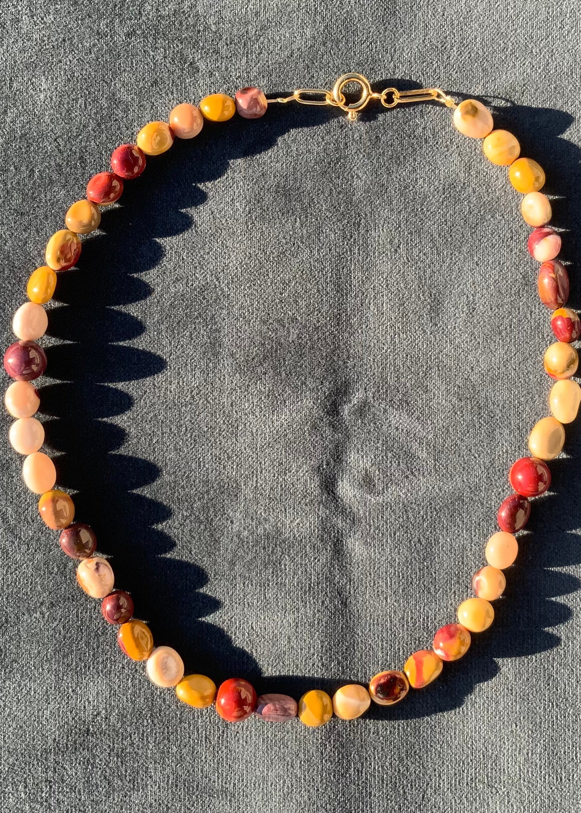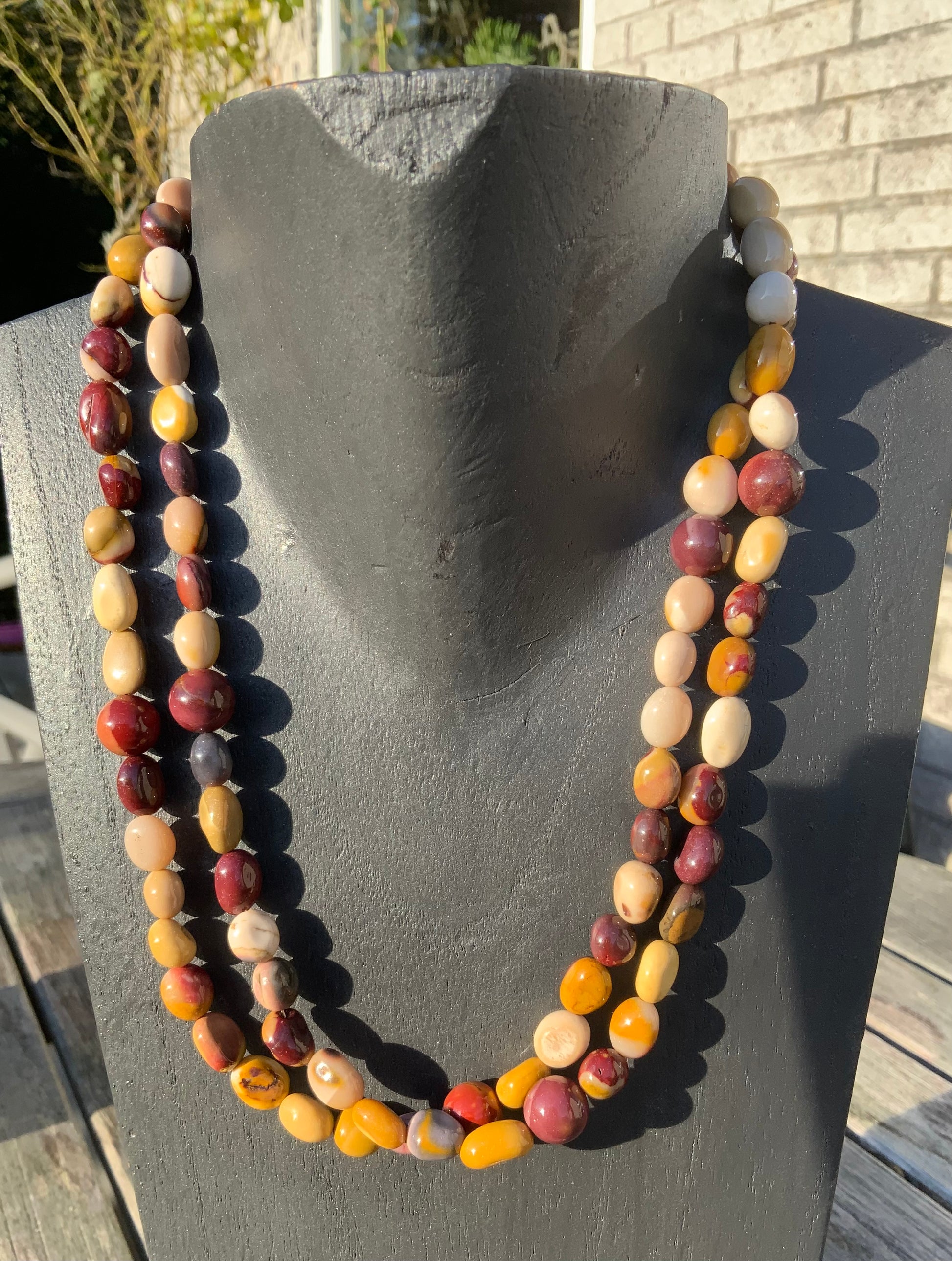 De smukke mokaitsten, med de dybe, mættede farver, fra dyb vinrød, til rosa, over gule, brune og råhvide nuancer, er her anvendt til en halskæde, som er 45 - 46 cm lang. Hver enkelt sten kan have adskillige nuancer, derfor vil hvert smykke være unikt.