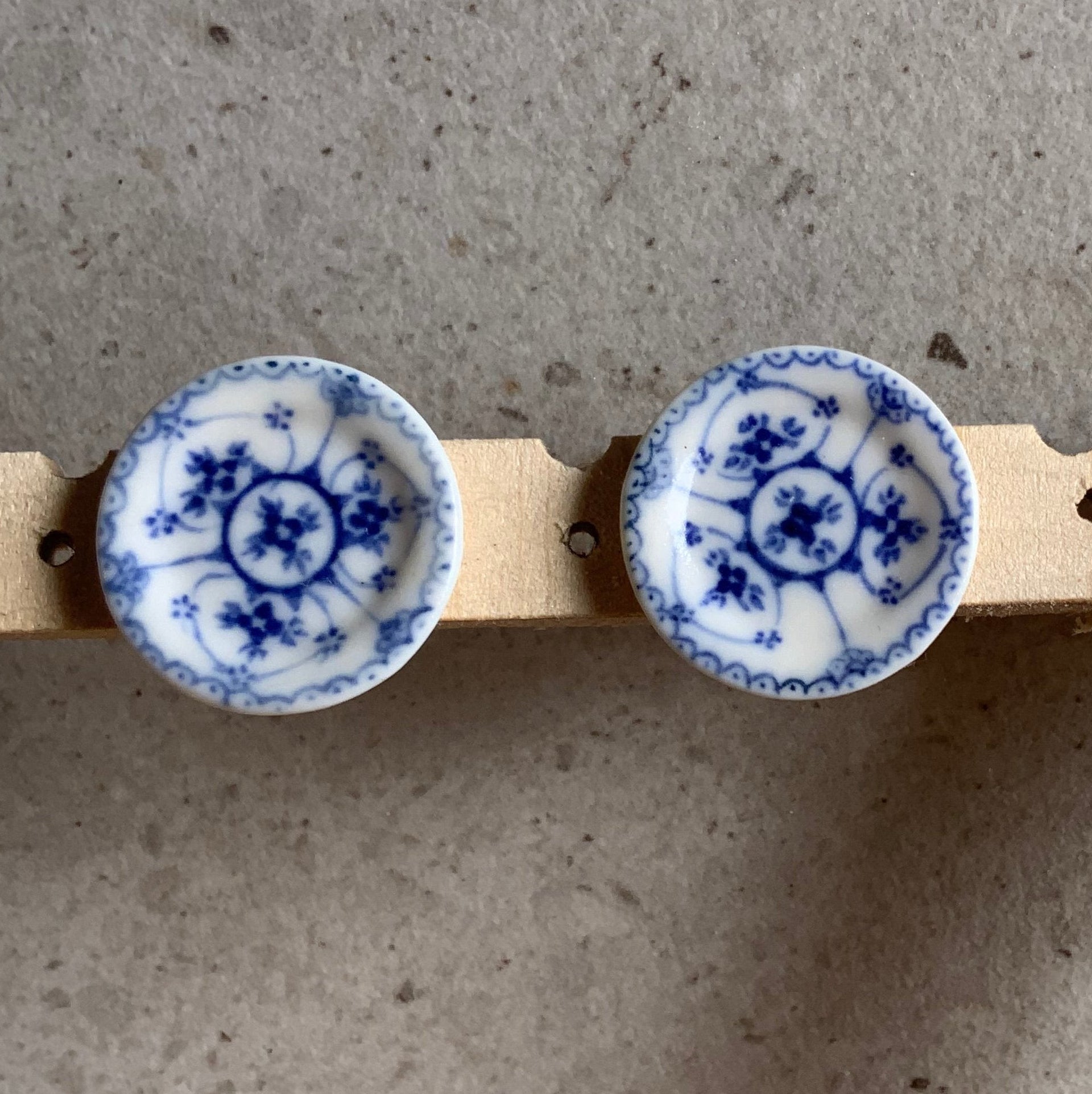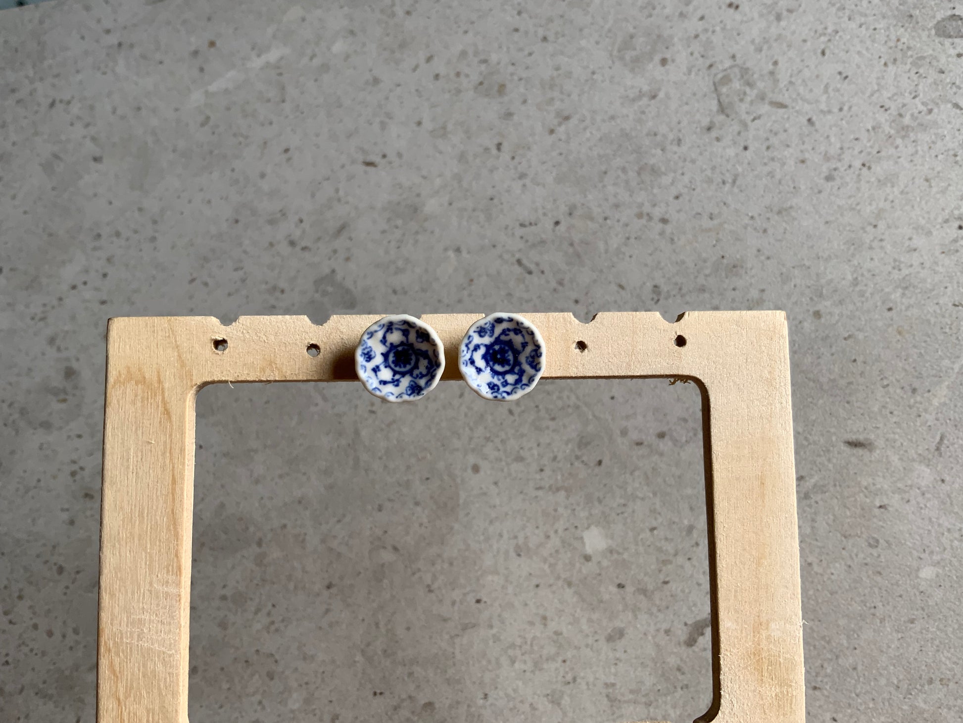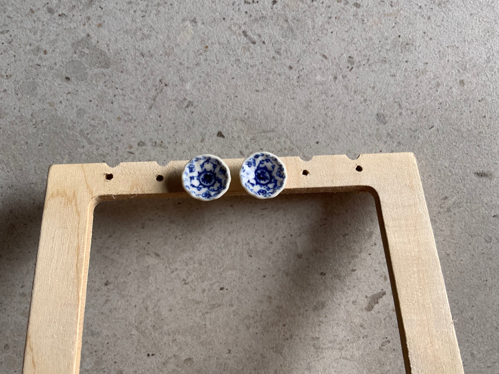 Ørestik med underkop i håndmalet musselmønster, fremstillet i porcelæn, monteret på en sølvstik.